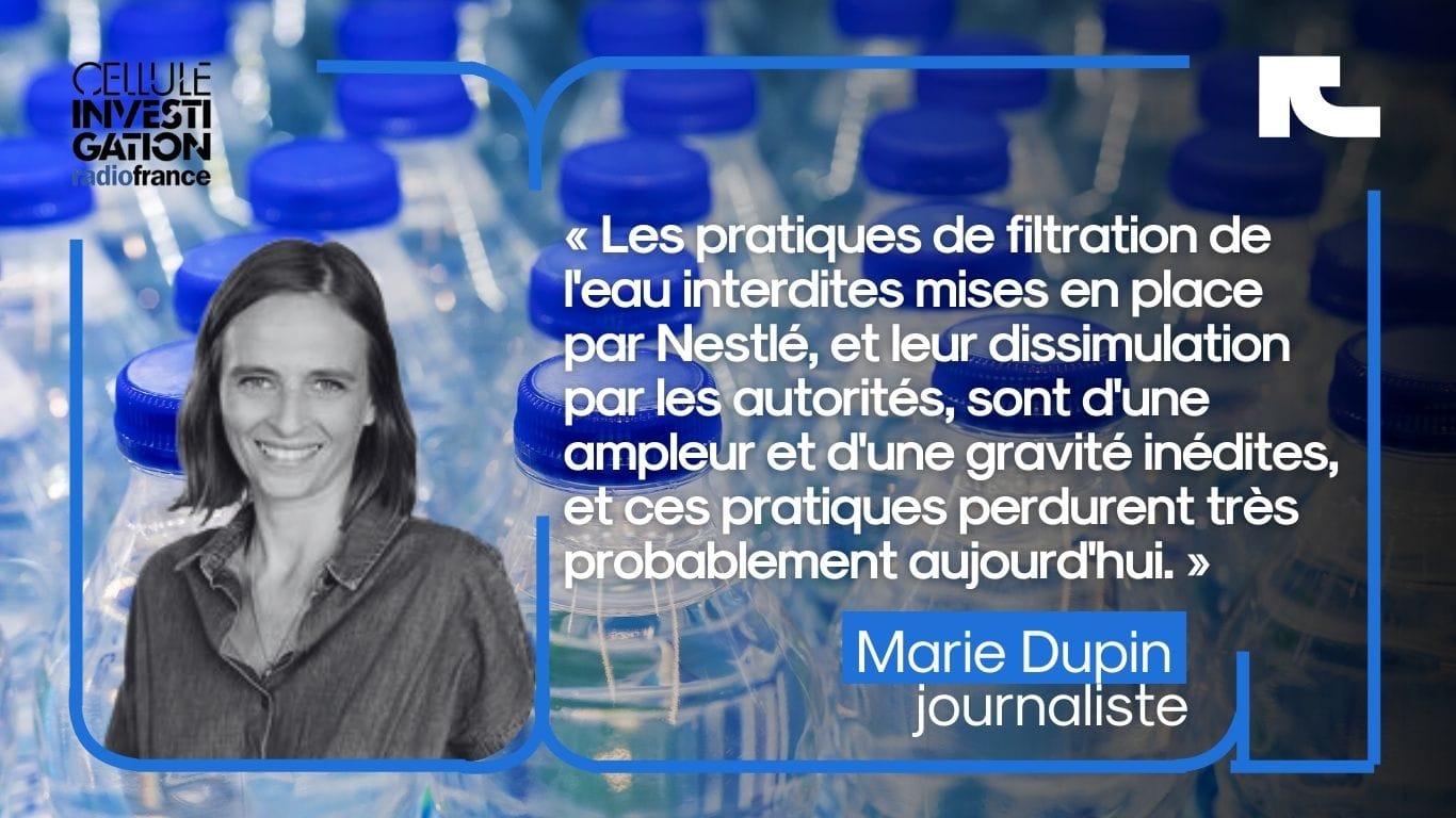 Marie Dupin est journaliste à Radio France, spécialisée dans les questions de santé publique, de consommation et d’environnement. Elle a collaboré avec Stéphane Foucart du journal Le Monde pour révéler des pratiques illégales dans l'industrie des eaux embouteillées, mettant en lumière des manquements graves des industriels et des autorités publiques.