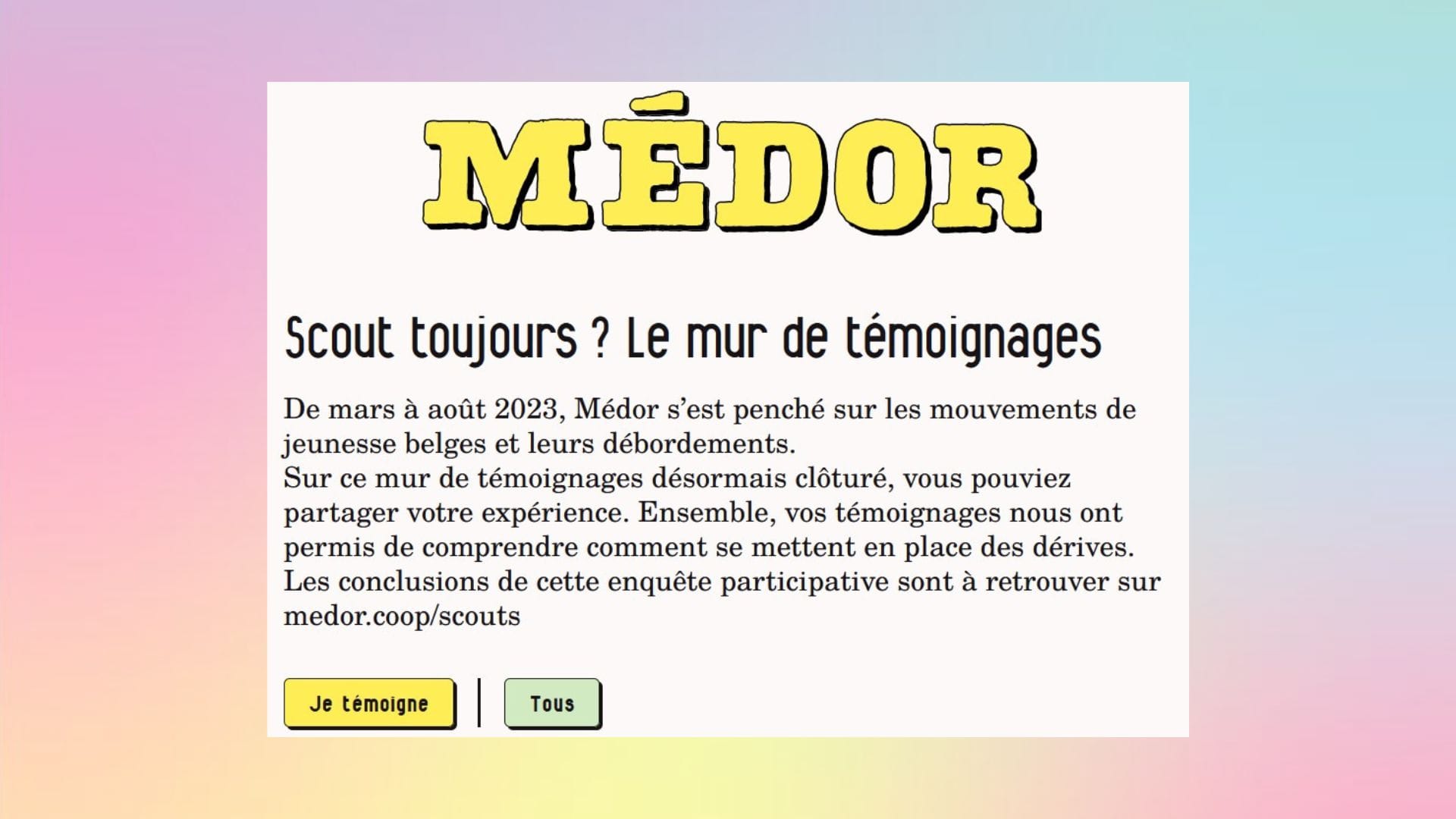 Pour mener leur enquête sur ce sujet très peu traité – les violences dans les camps scouts étant jusqu'alors surtout médiatisés via le biais des « faits divers » –, l'équipe de Médor met en place un dispositif singulier, fondé sur le journalisme participatif. Concrètement, en parallèle du dialogue que le média engage avec les principales fédérations de scoutisme du pays – qui confirment d'ailleurs le problème –, Médor ouvre un mur de témoignages appelant les victimes, témoins ou auteurs de faits de violence au sein des mouvements de jeunesse à témoigner de leur expérience.
