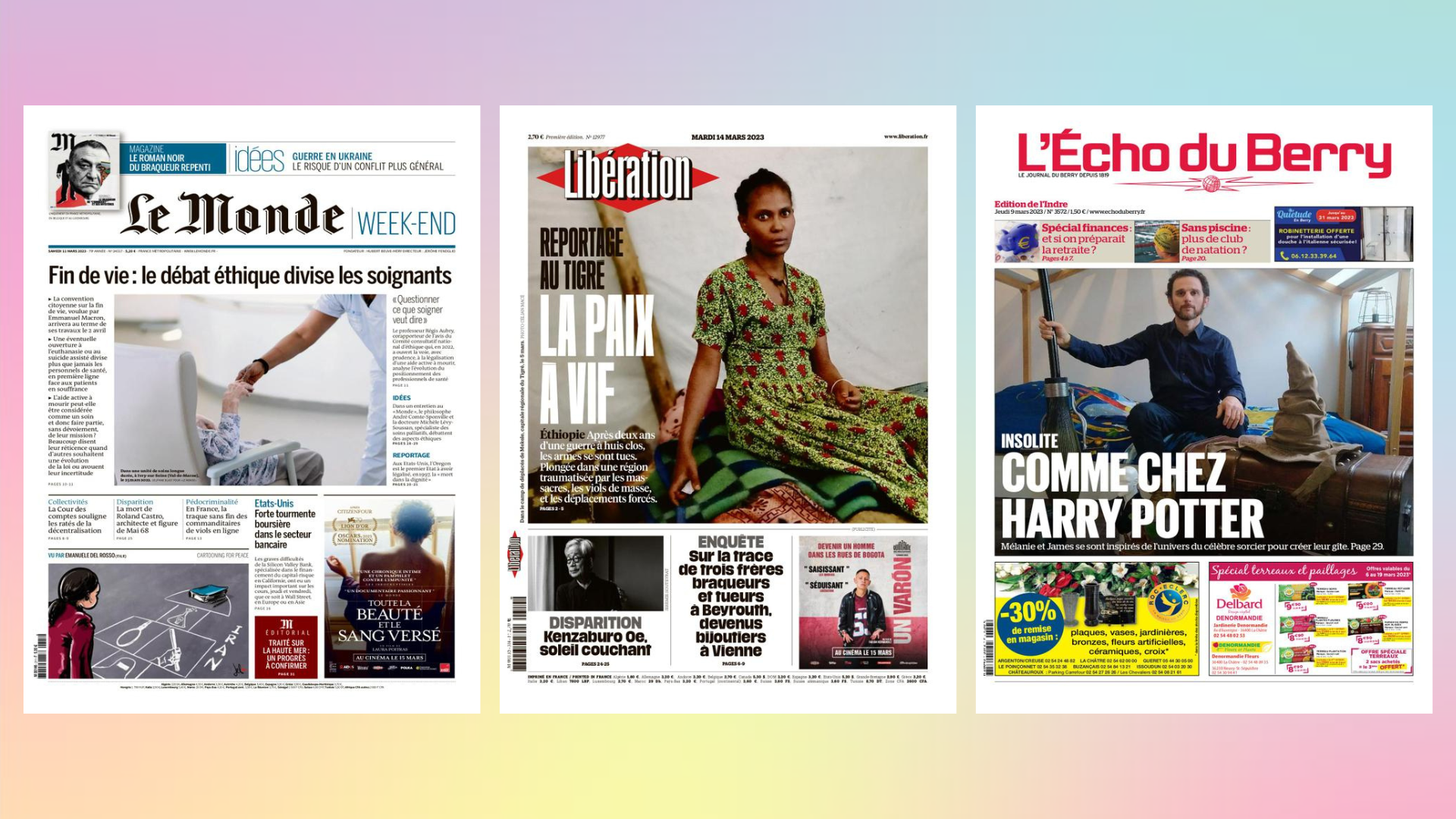 👨⚕️ Fin de vie — En mars 2023, Le Monde s'attaque en Une à un sujet particulièrement sensible : la fin de vie. Le quotidien souligne comment l'éventualité d'une dépénalisation de l'euthanasie ou du suicide assisté pose question aux professionnels de santé en première ligne. Un sujet toujours autant d'actualité, alors qu'Emmanuel Macron vient d'annoncer un projet de loi pour avril prévoyant une « aide à mourir » sous « conditions strictes ».