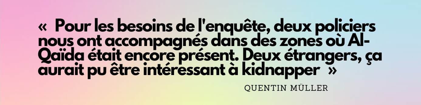 Quentin Müller — C'est le destin qui m'a gâté. Mes premiers reportages m'ont mené là-bas et à partir de là, j'ai découvert une région qui me passionne, qui m'a beaucoup ému, beaucoup plu et à laquelle je me suis attaché. Dans cette région, je suis ensuite tombé amoureux du Yémen, de sa beauté, de sa diversité culturelle, identitaire et historique. Les Yéménites sont très sympas, très drôles. Forcément, ça aide beaucoup. La rencontre avec ce pays, ses habitants a changé le regard que je porte sur le journalisme, sur le façon dont je le conçois.