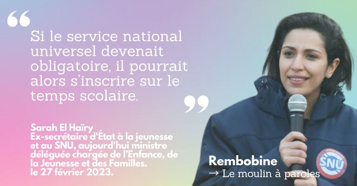 Sarah El Haïry confirmera ses propos en juin, en annonçant dans Le Figaro, que le SNU pourra se tenir sur deux semaines en classe de seconde pendant le temps scolaire. Avec la création d’un label « classe et lycée engagé », qui permet d’inscrire le SNU sur temps scolaire, et un projet de décret proposant aux élèves de seconde de ne pas faire leur stage obligatoire de fin d’année s’ils réalisent les douze jours de cohésion, cette ambition se matérialise doucement. Lors de son discours de politique générale, Gabriel Attal l'a promis pour...2026.