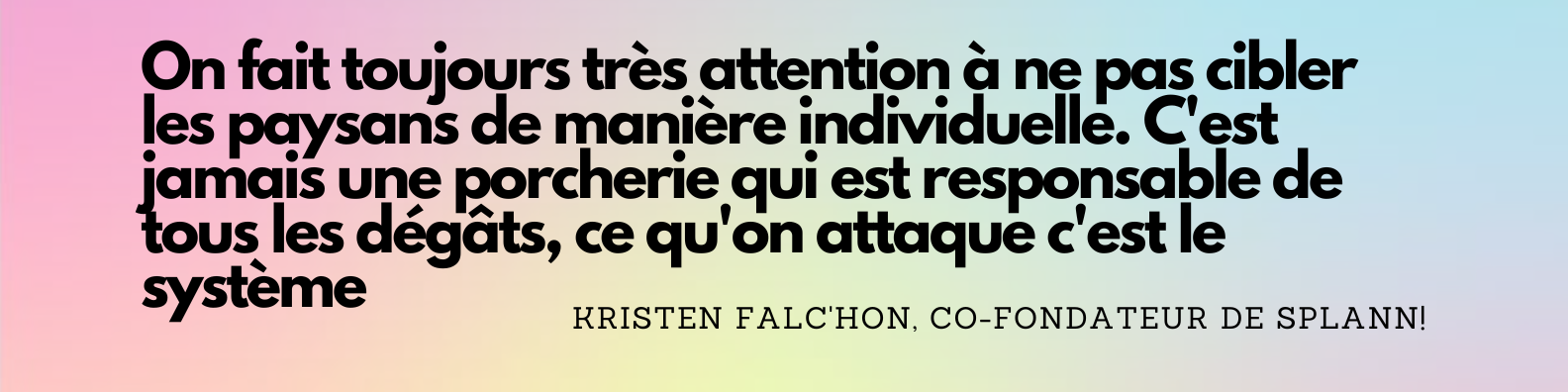 De la même manière, dans notre ligne, on fait toujours très attention à ne pas cibler les paysans de manière individuelle. Il faut qu'on soit vigilant. Moi, parfois, en écrivant, je me dis « punaise, faudrait pas qu'il se foute en l'air après la parution de l'article ». Ce n'est jamais une porcherie qui est responsable de tous les dégâts, ce qu'on attaque c'est le système.