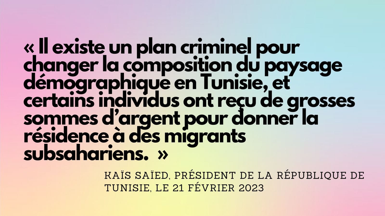 Les organisations de la société civile ainsi que l’Union Africaine ont très rapidement et fermement dénoncé ce “discours haineux à caractère raciste, susceptible de nuire aux personnes”. Cette déclaration souscrit à la théorie conspirationniste du « grand remplacement » du militant français d'extrême-droite identitaire Renaud Camus. Elle prédit une supposée substitution inexorable d’une population européenne par une population immigrée. Pour Kaïs Saïed, il s’agirait alors du remplacement d’une population arabe par une population noire.