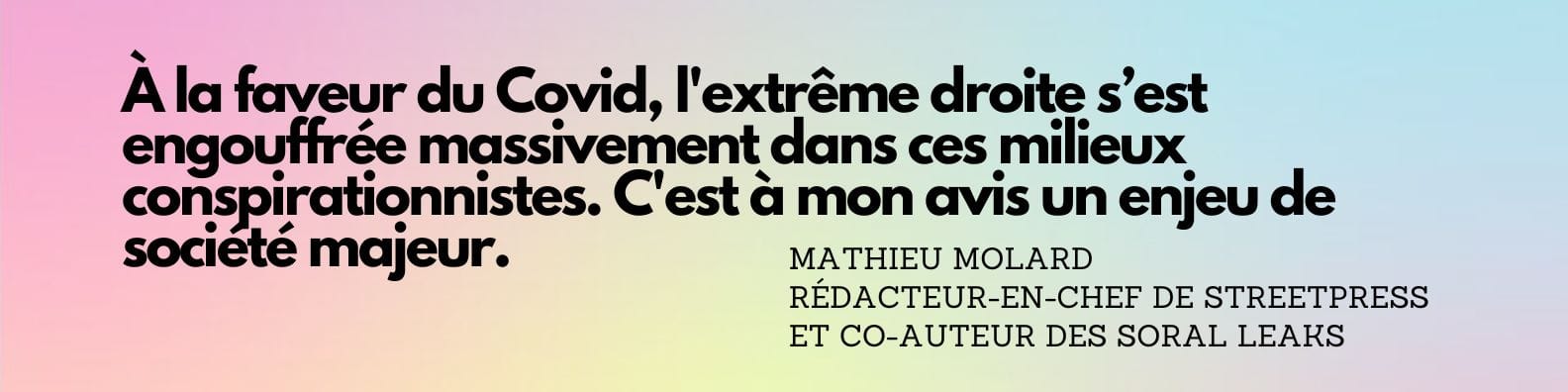 Mathieu Molard — Dans les médias, il y a parfois un côté “ça ne parle pas à nos sphères, donc on estime que ça doit être très marginal.” Oui, les “conspi-antivax”, c'est une frange de la population qui croit en des théories souvent fumeuses. Mais ça représente une part des Français·es qui n'est pas négligeable. À la faveur du Covid, l'extrême droite s’est engouffrée massivement dans ces milieux conspirationnistes, c'est à mon avis un enjeu de société majeur. On a quelque peu négligé Soral en 2015 et on voit que ses théories conspirationnistes, antisémites, homophobes et négationnistes ont infusé dans de nombreux discours. On est en train de le payer aujourd'hui. Ça va laisser une trace dans la société et on va en voir des réminiscences pendant des années et des années.